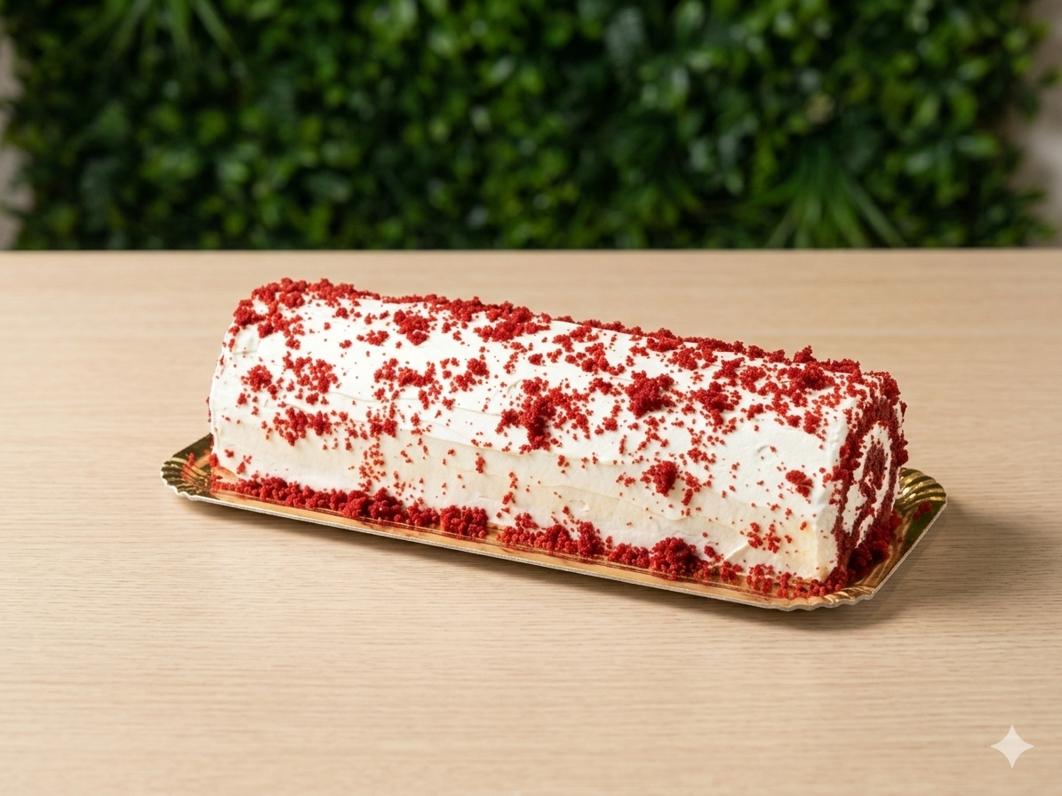 Rolo de massa leve e aveludada, decorado com generosa cobertura de creme branco e polvilhada com raspas vermelhas, ideal para fatiar e partilhar.