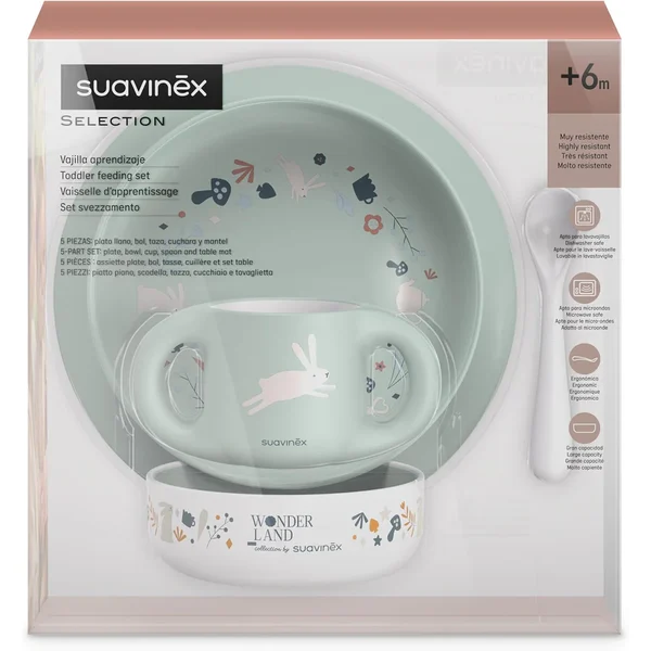 O Set Louça de Aprendizagem da Suavinex é o kit ideal para acompanhar a introdução alimentar do bebé a partir dos 6 meses, facilitando a transição para a alimentação independente de forma segura, prática e divertida. O conjunto inclui 5 peças cuidadosamente pensadas para as primeiras experiências à mesa: Prato raso – ideal para alimentos sólidos, dimensionado para porções adequadas à idade do bebé;