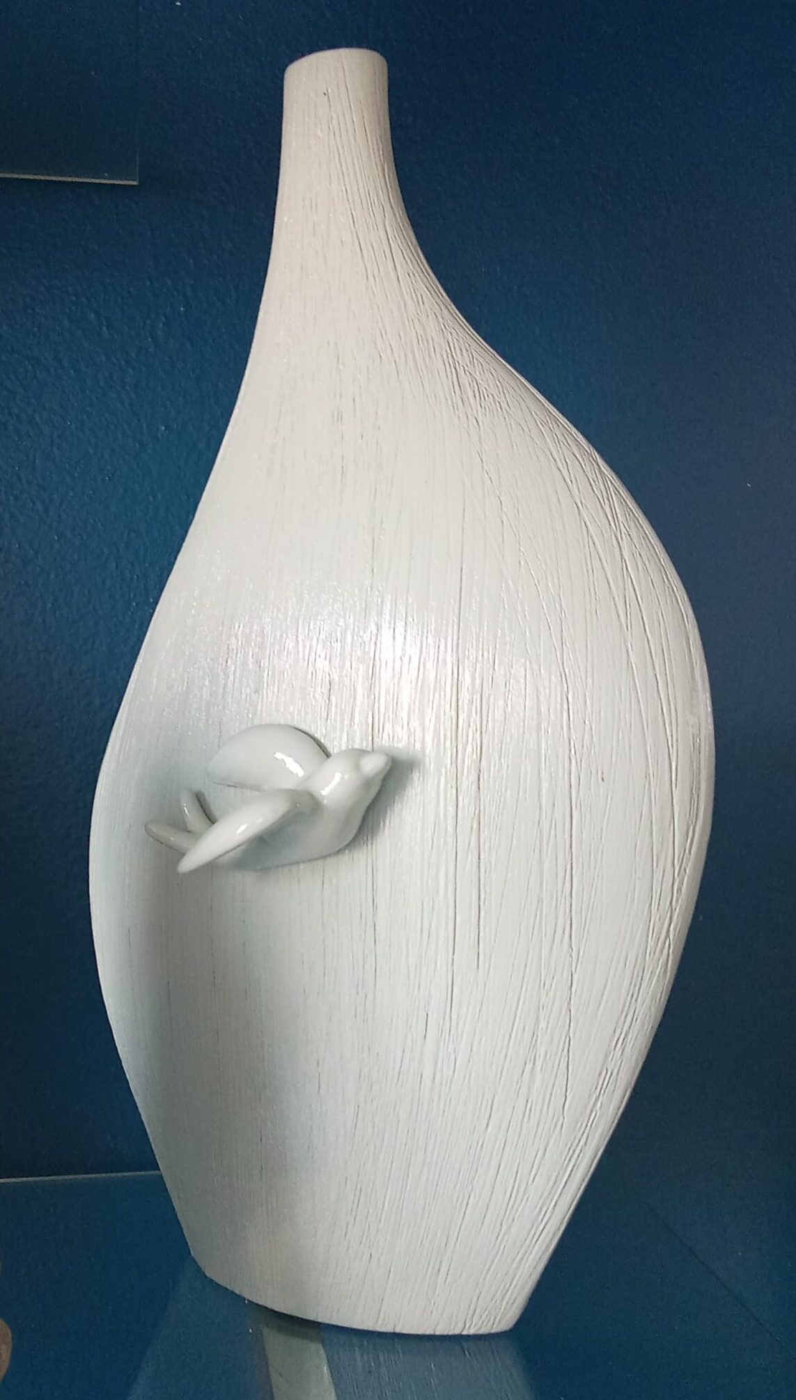 Jarra com detalhe de pássaro em relevo, design contemporâneo.