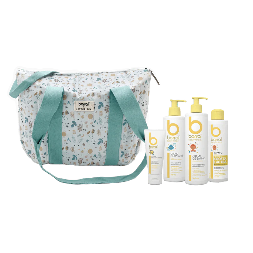 Kit completo de higiene e cuidado para recém-nascidos e bebés da reconhecida gama BabyProtect Barral. Inclui creme de banho (500 ml), creme hidratante (400 ml), champô (200 ml) e creme muda fraldas (75 g), em mala impermeável com alças adaptáveis ao carrinho.