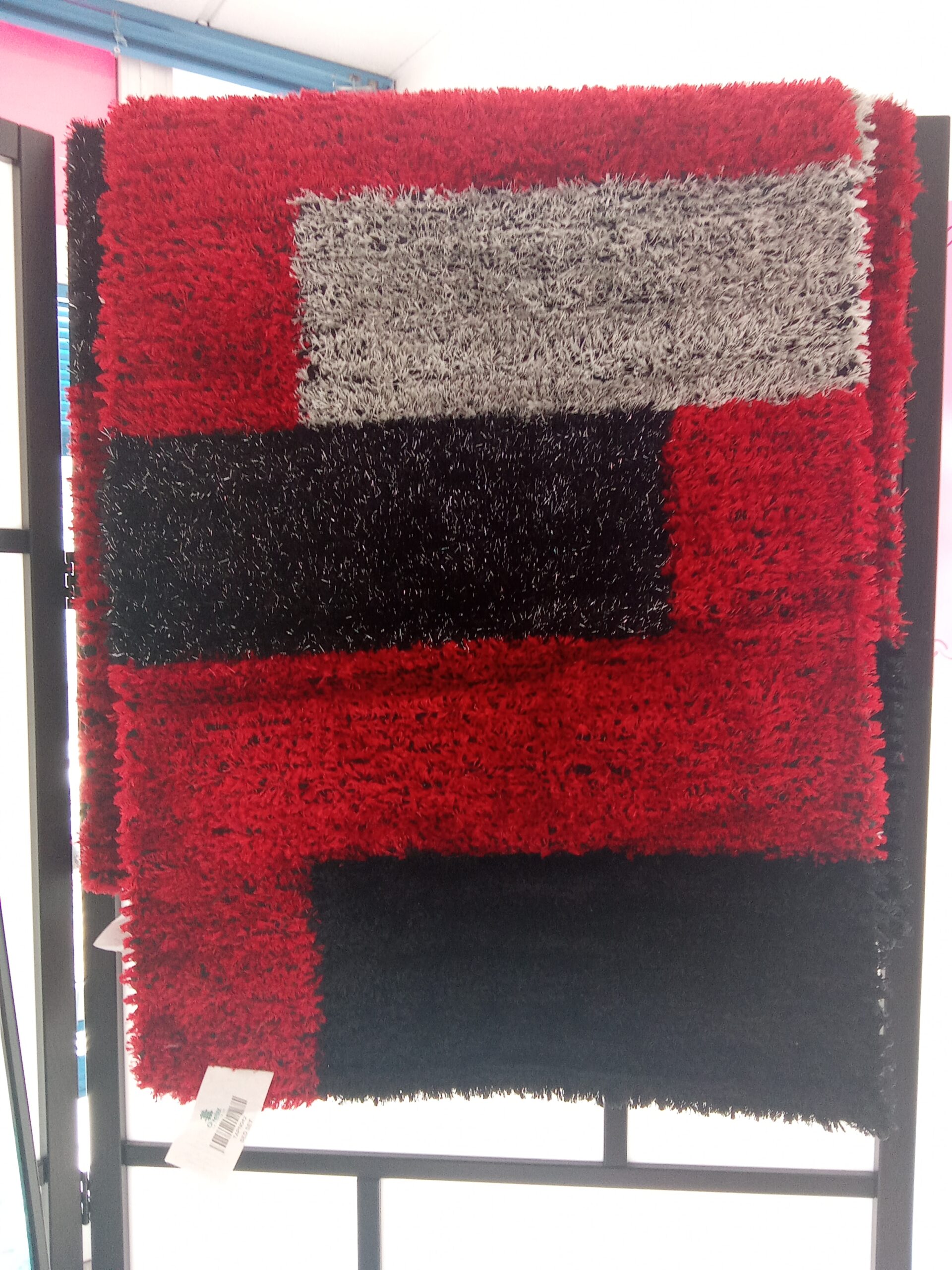 Dê vida e conforto à sua sala ou quarto com este tapete de estilo Shaggy. Com um padrão geométrico arrojado em tons de vermelho, preto e cinza, é a peça ideal para quem procura uma decoração moderna e uma sensação suave ao caminhar.